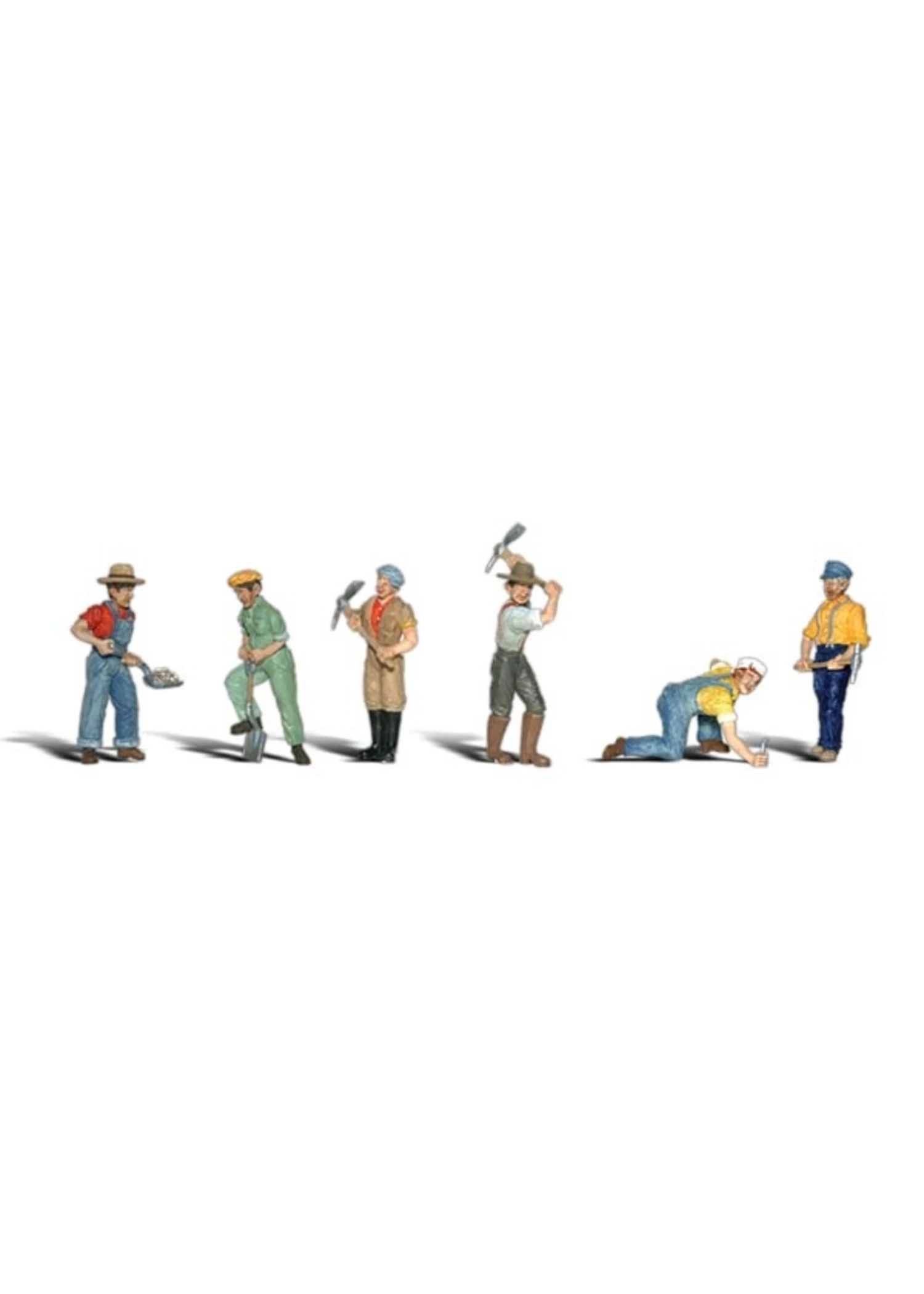 One man bravely holds a rail spike while another prepares to pound it with a sledge hammer. Two men hold pickaxes, one man swings his high over his head and two other men shovel.