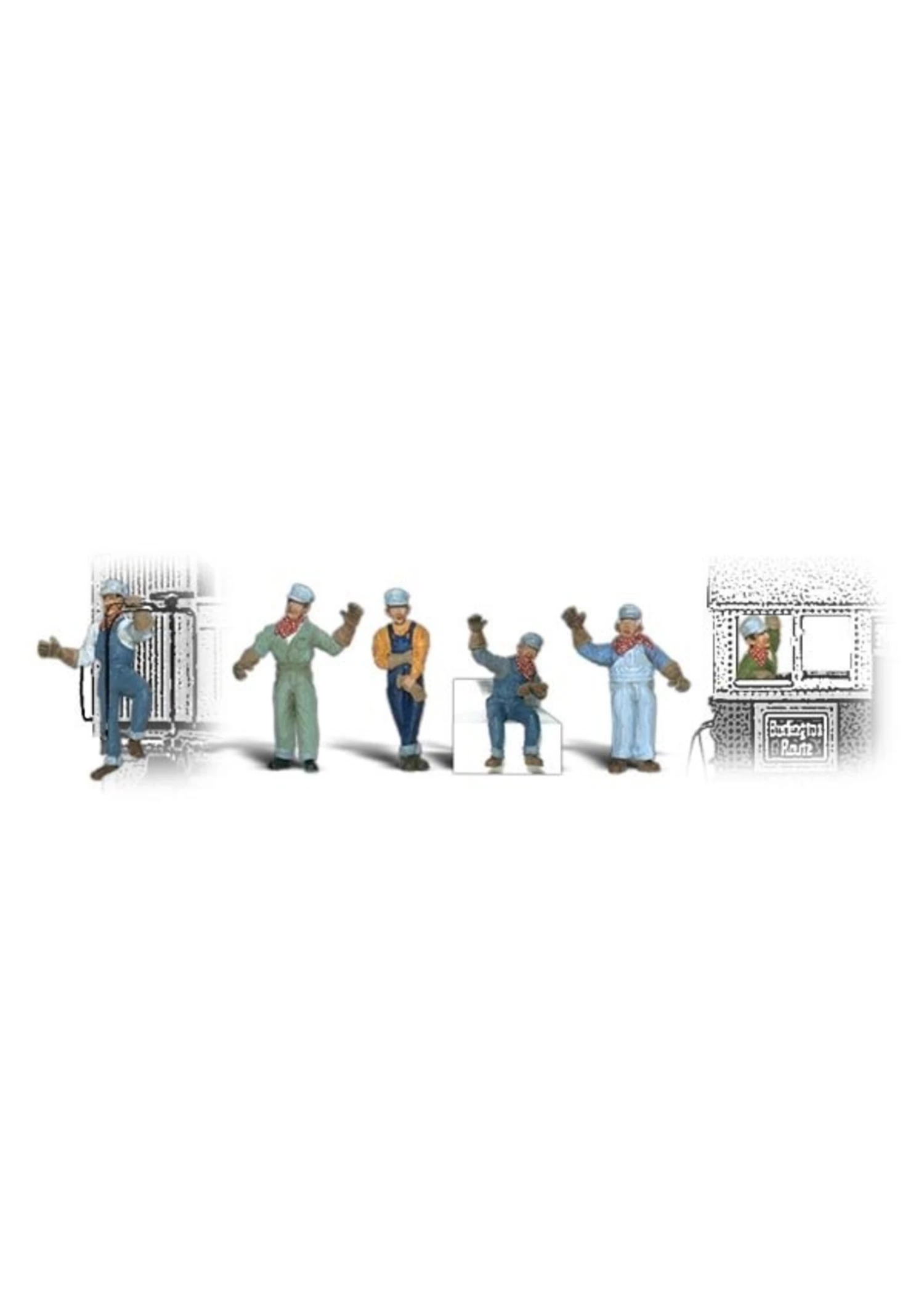 Engineers in various standing and sitting positions, all very animated in their work gear.