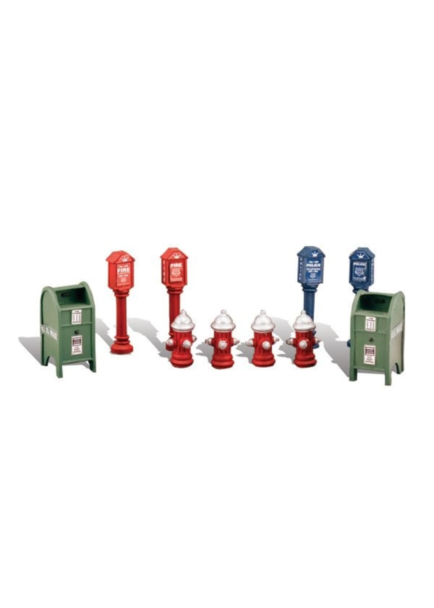 Accessorize a street scene with items that includes fire hydrants, street mailboxes and emergency fire and police call boxes.