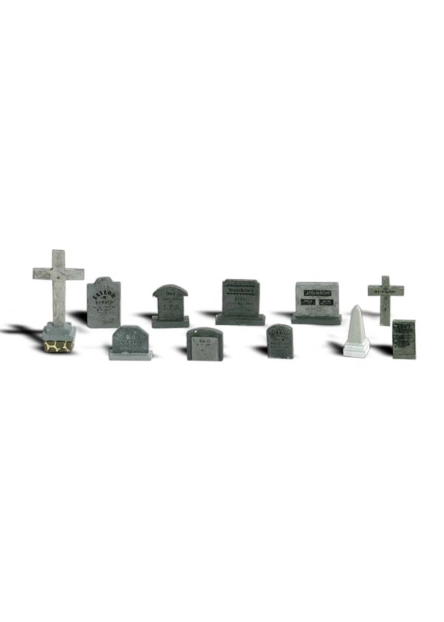 Eleven pieces are included in this assortment of square, rounded, cross and obelisk tombstones.