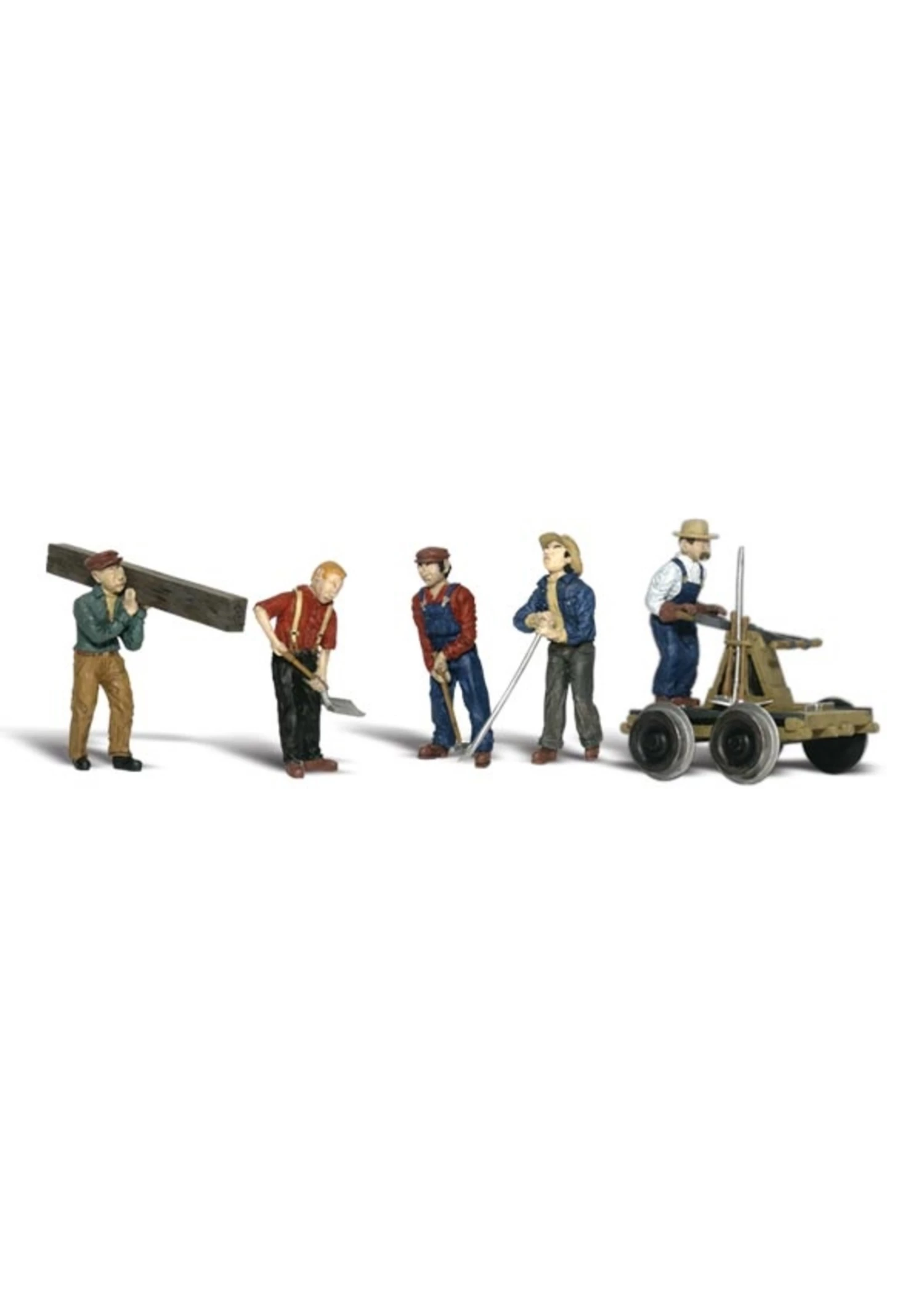 Five railroad workers with tools, railroad ties and a rail handcart.