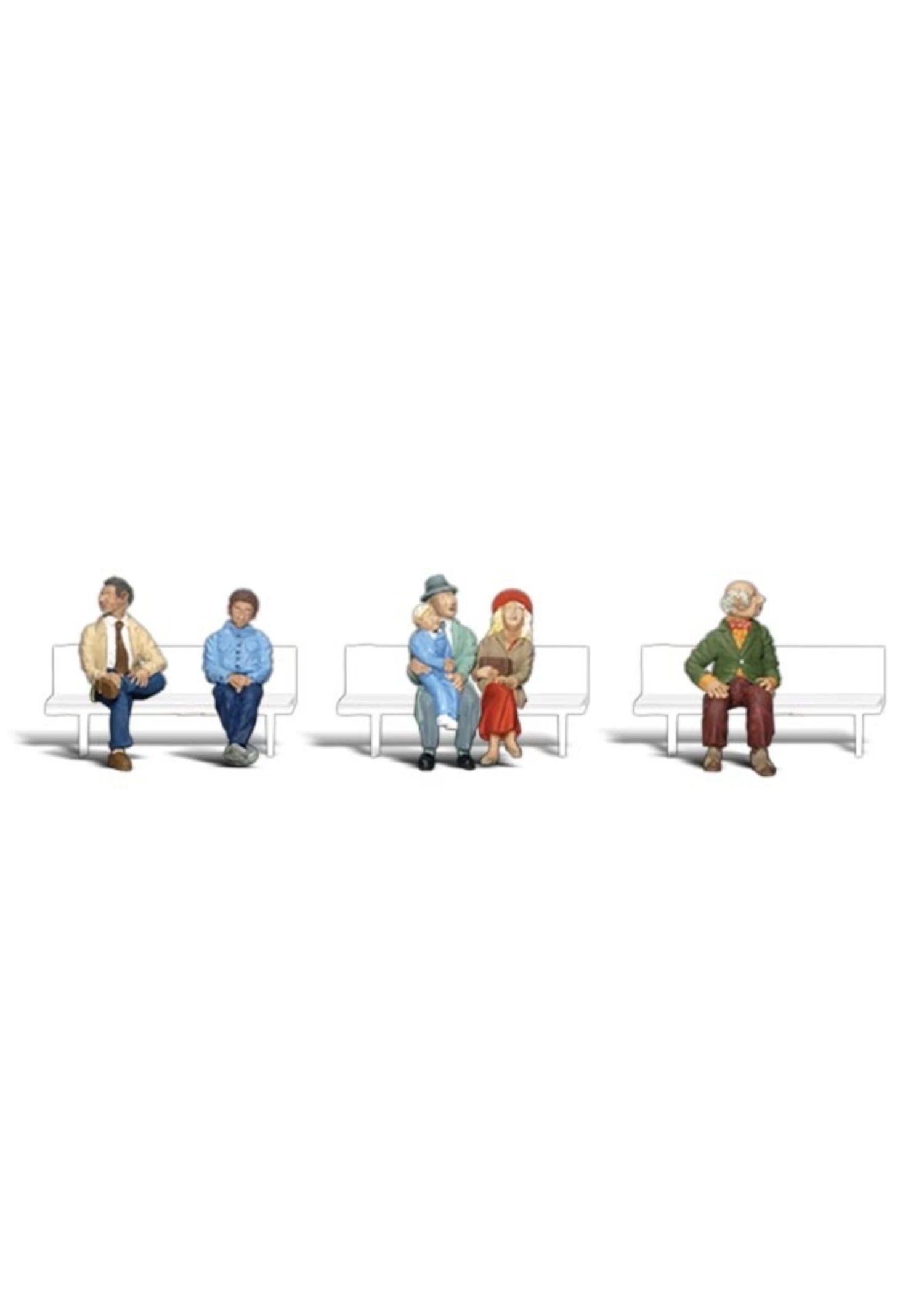 A set of figures in sitting position – three individual men, a mother and a father and child.