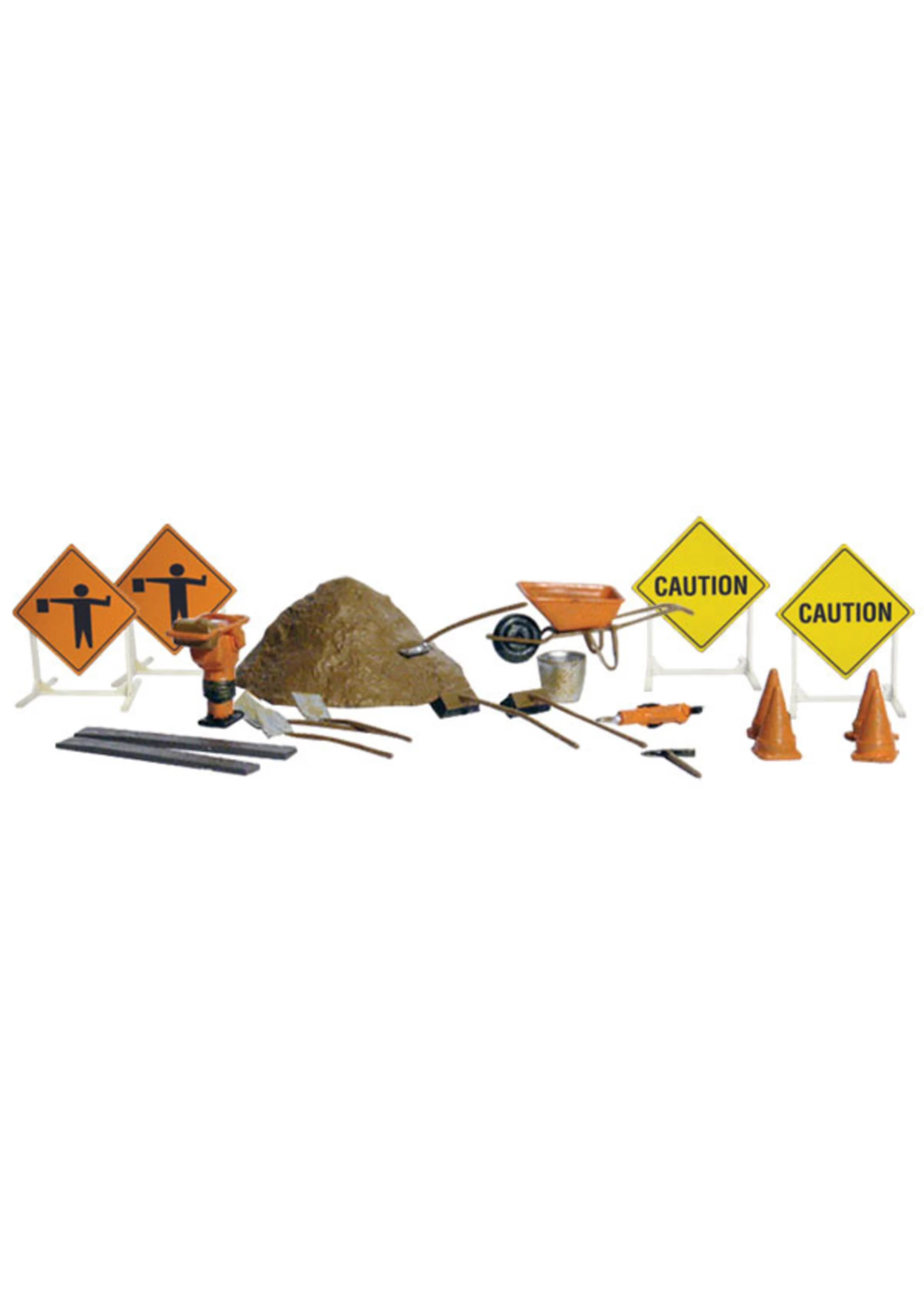 Set includes an assortment of Road Crew tools and supplies: warning signs, cones, a wheelbarrow, shovels, rakes, poles, a pile of ballast and a bucket.