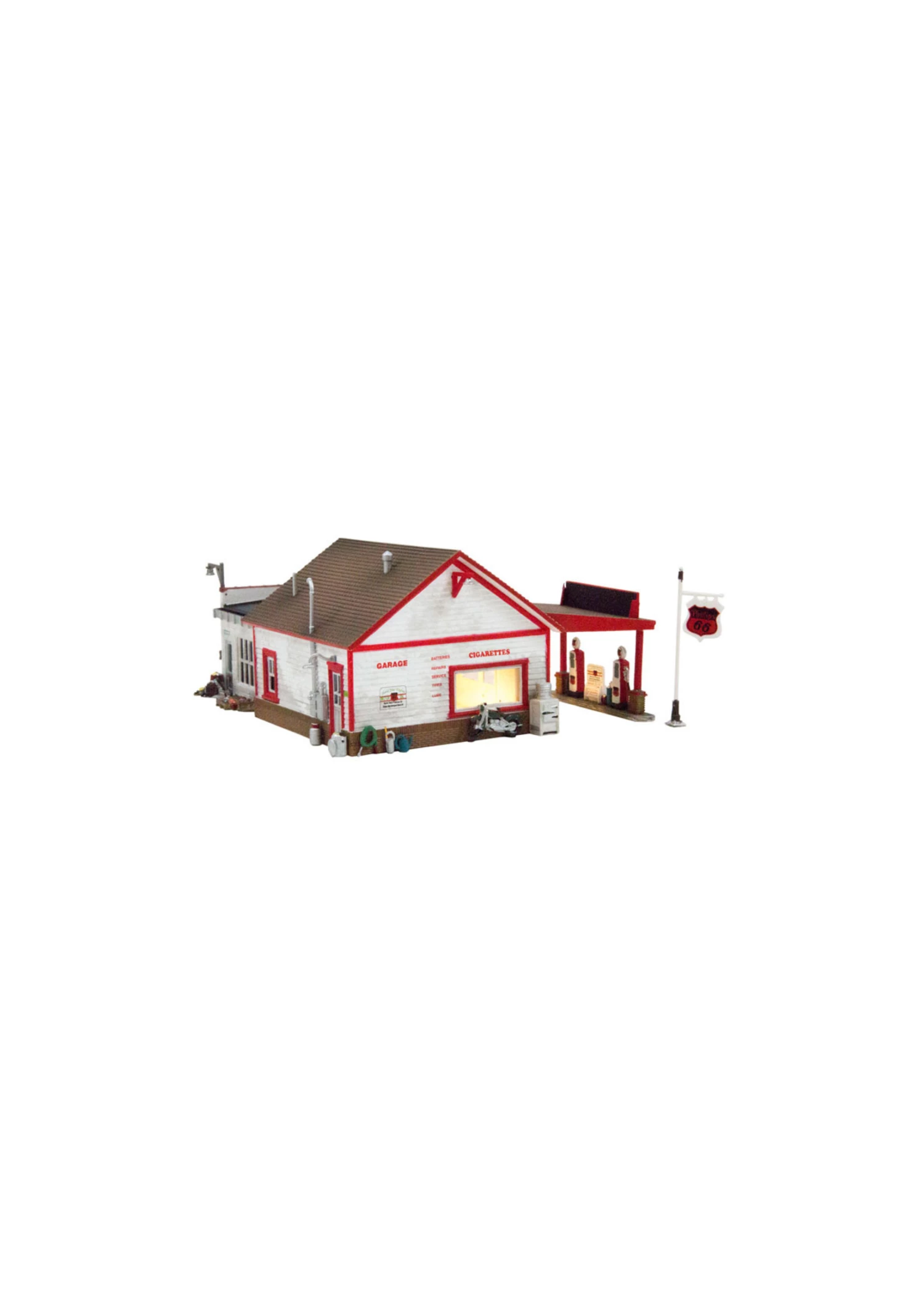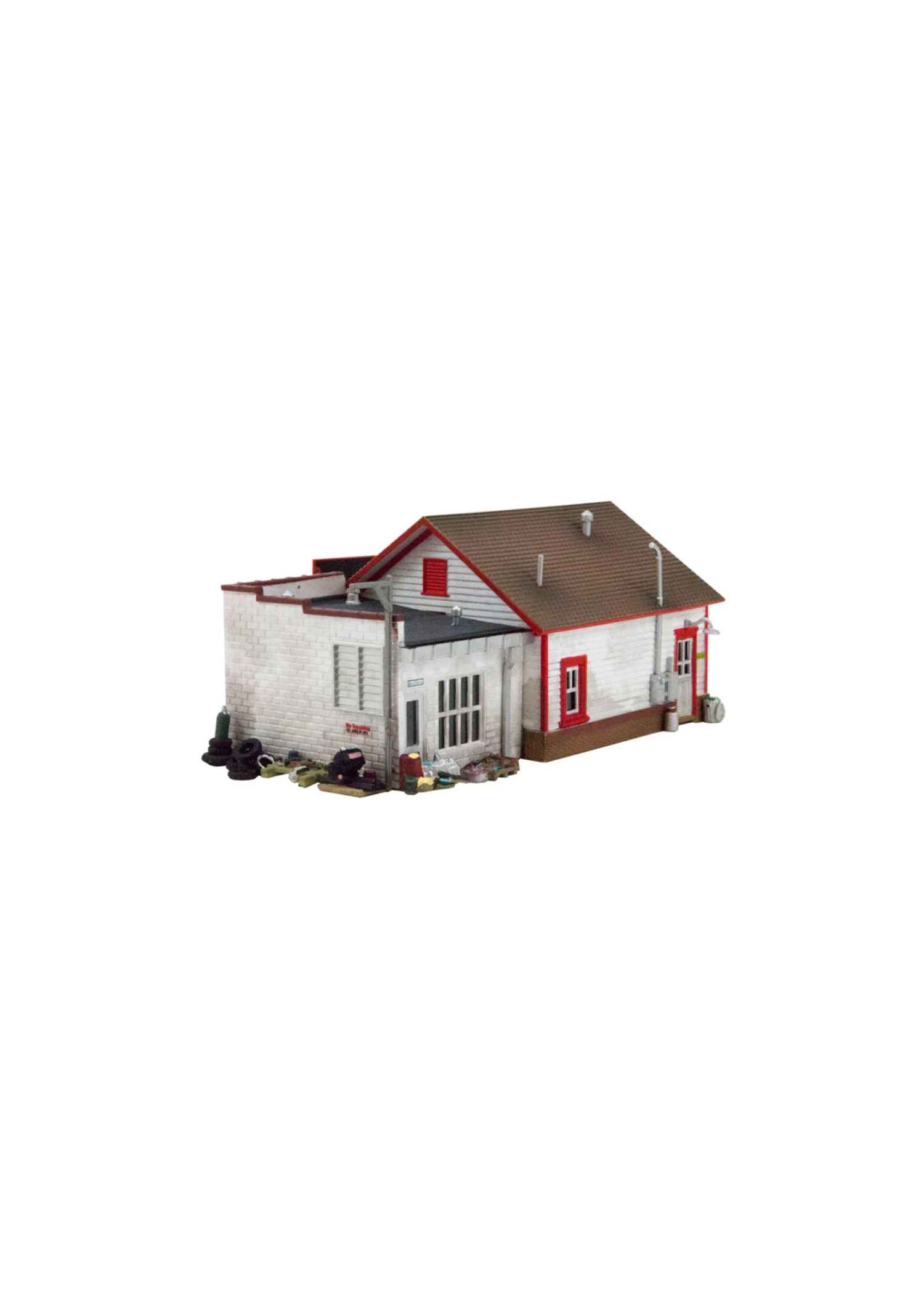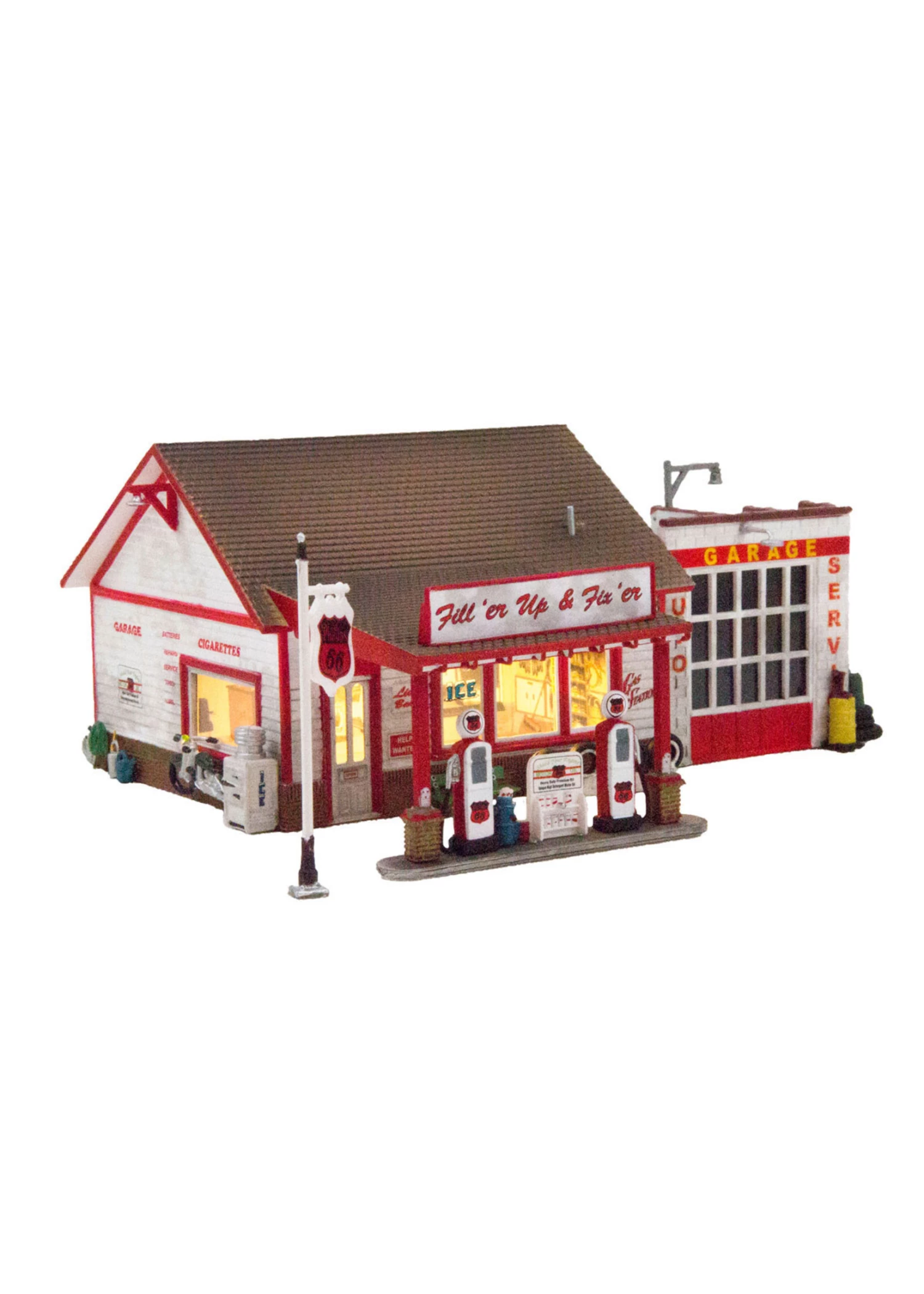 Layout residents can savor a Yoo-hoo or a sody-pop while waiting for the mechanic to change the oil and fix a tire. Details include signs, posters, old gas pumps, old and new tires, a pop machine, junk and more! See photos for footprint.