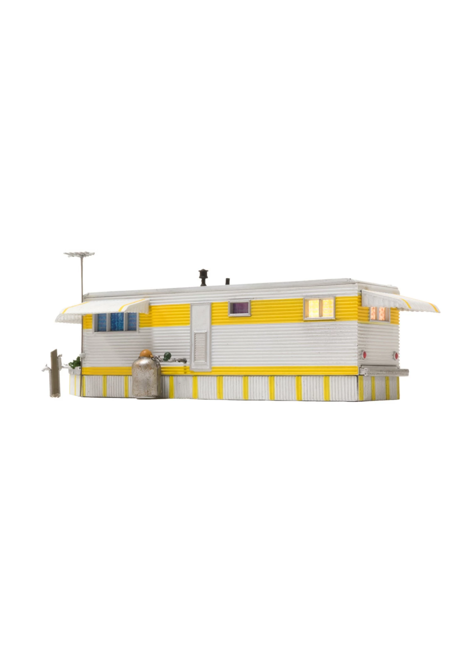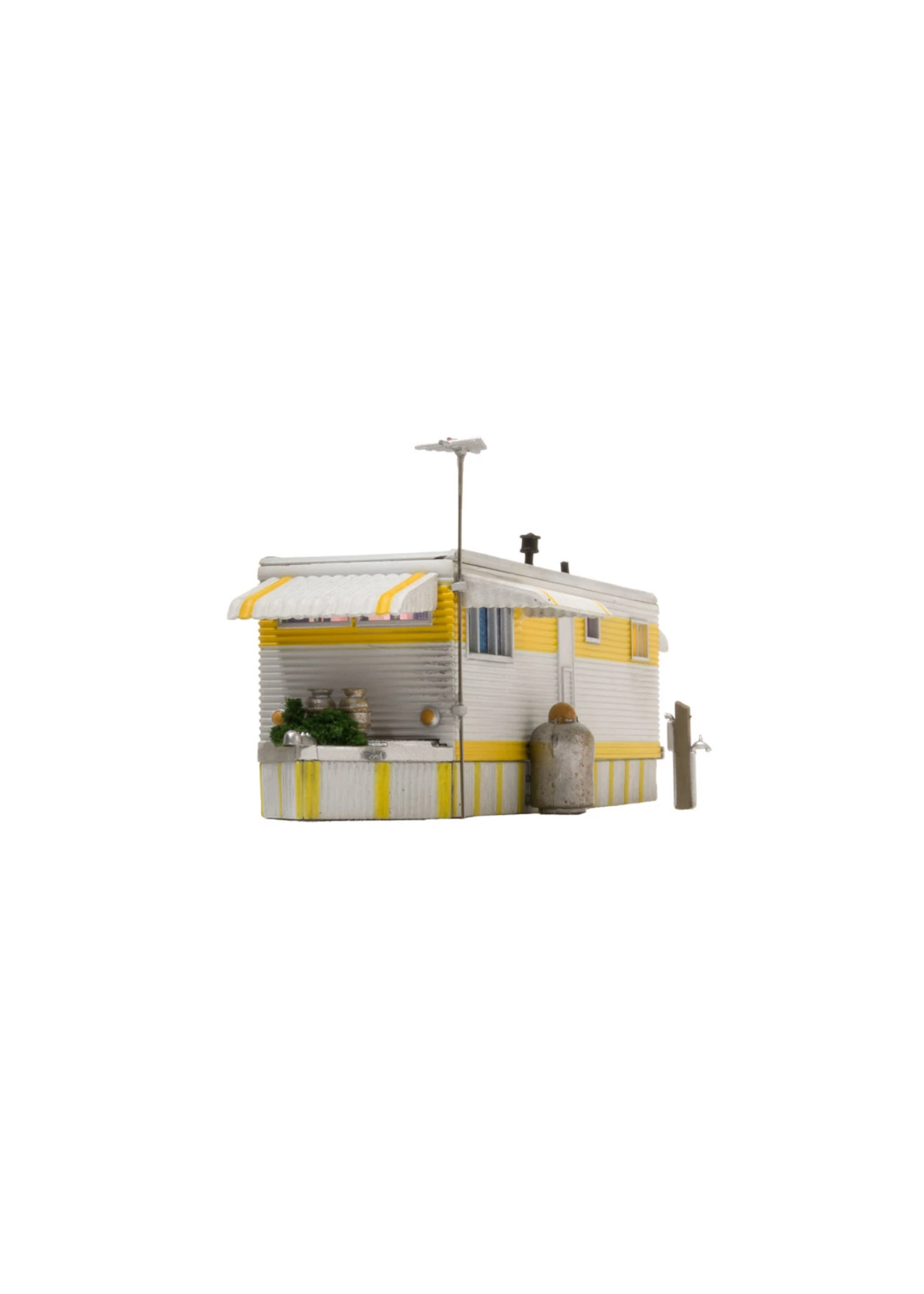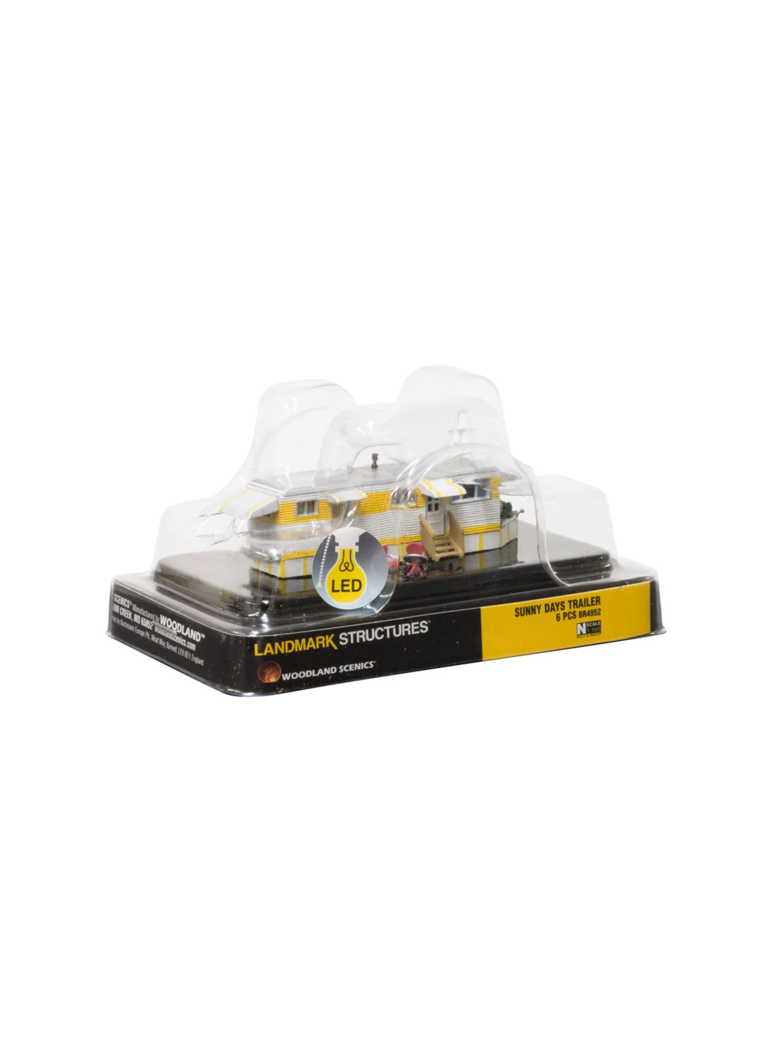 Give your layout a bright and happy home anyone will love. The Sunny Days Trailer is perfect for adding some cheer to your layout. Building details include multiple awnings for plenty of shade, wooden railings and steps, a TV antenna, window treatments, a trashcan and several doors and windows. Additional features include an unattached table and chairs for custom placement. See photos for footprint.