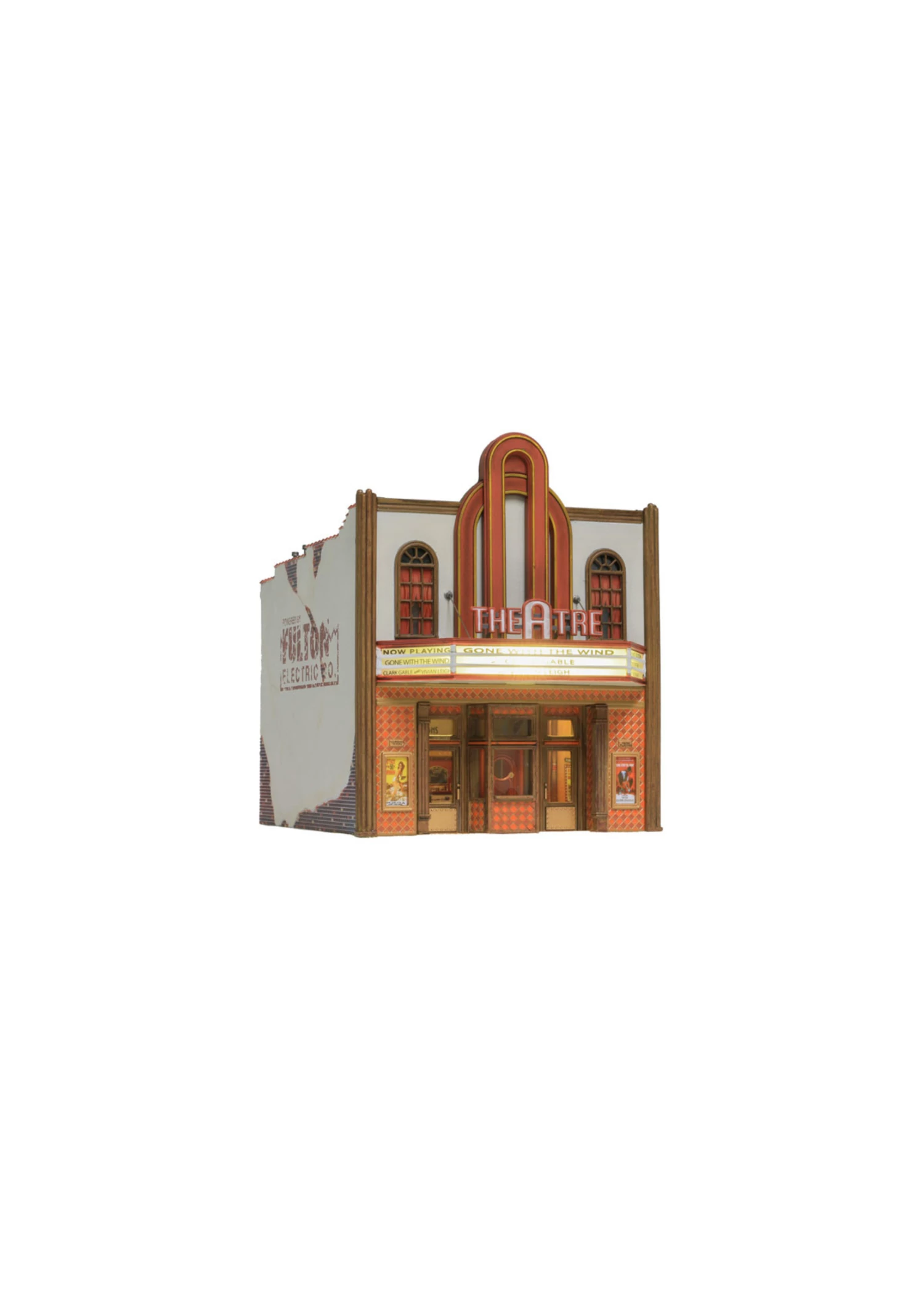The Theatre offers classic vintage architecture, an expertly weathered stucco-over-brick exterior, tall arched windows, gilded kick plates on front doors, a decorative tile facade and carved wood trim. Window treatments and decals are included. This building features a first-floor printed interior, a lighted marquee and one interior light.