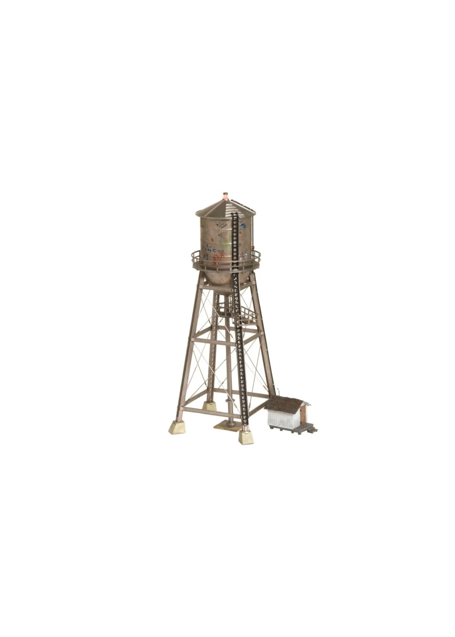 Clean water is a natural resource that is vital to everyday life. Make sure town residents always have access with the Rustic Water Tower. Building details include a center scaffold for tower inspection, an elevated water tank, metal cross cables and trusses for stability. Authentic weathering and graffiti add character to this aging structure. Additional features include a ladder for replacing the aircraft warning light at the top of the tower and an unattached pump house for custom placement.