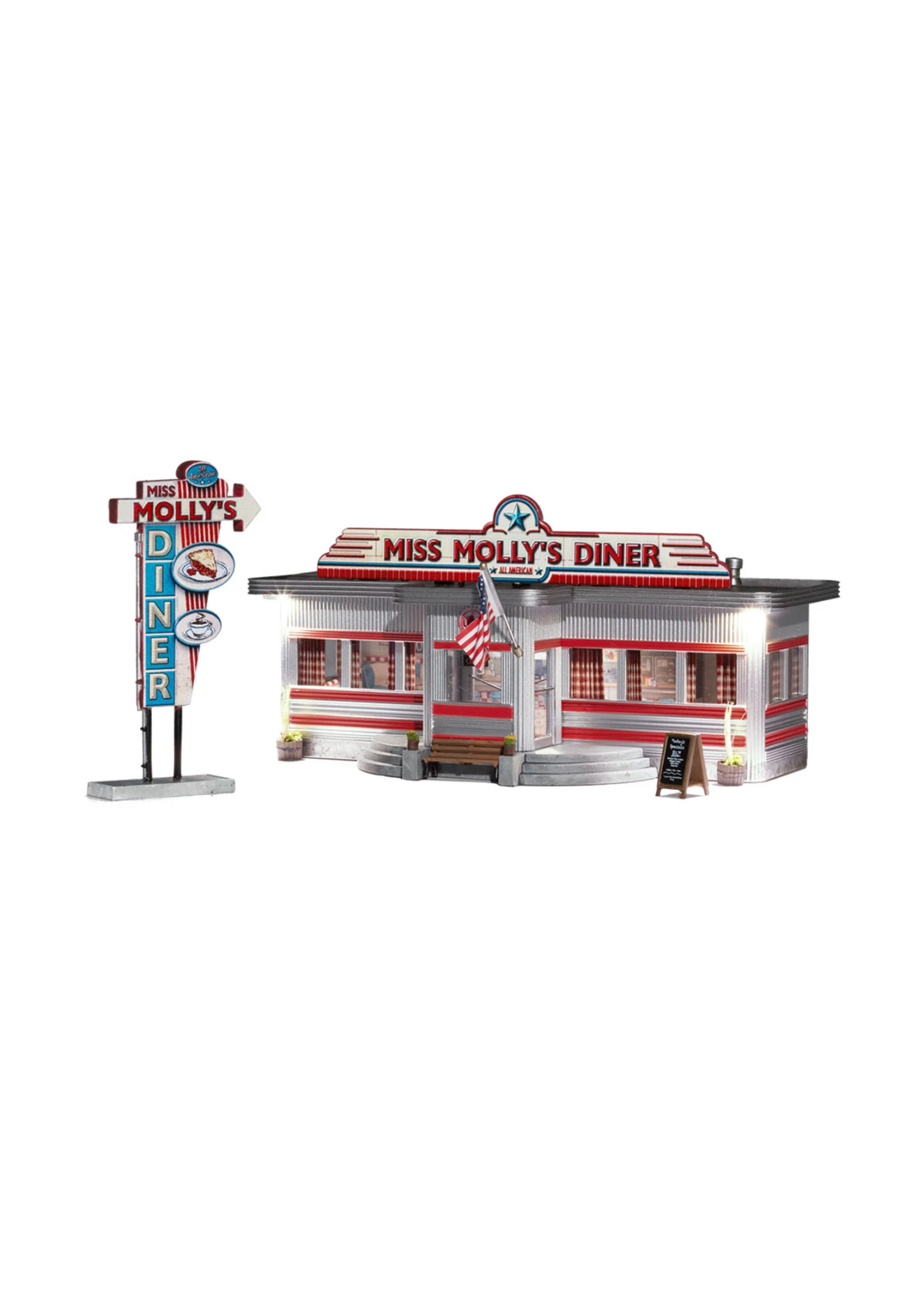 Miss Molly’s Diner welcomes you with a spoonful of some good home cookin’. This HO Scale Built-&-Ready® is styled like a train car eatery, hand-painted and authentically weathered for realism. It features a detached, classic sign, a menu board and other details for custom placement. The ready-made structure has an eye-catching printed interior complete with booths, a kitchen and other authentic diner features. This local establishment is open for business on your layout right of the package.
